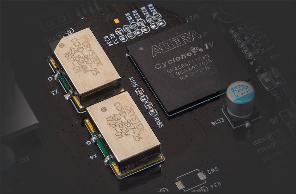 Die diskrete Architektur erlaubt eine direkte Nutzung von Takt- und Wandlungsstufen ohne Zwischenteiler. Das Ergebnis: präziseres Timing und deutlich vermindertes Jitter.