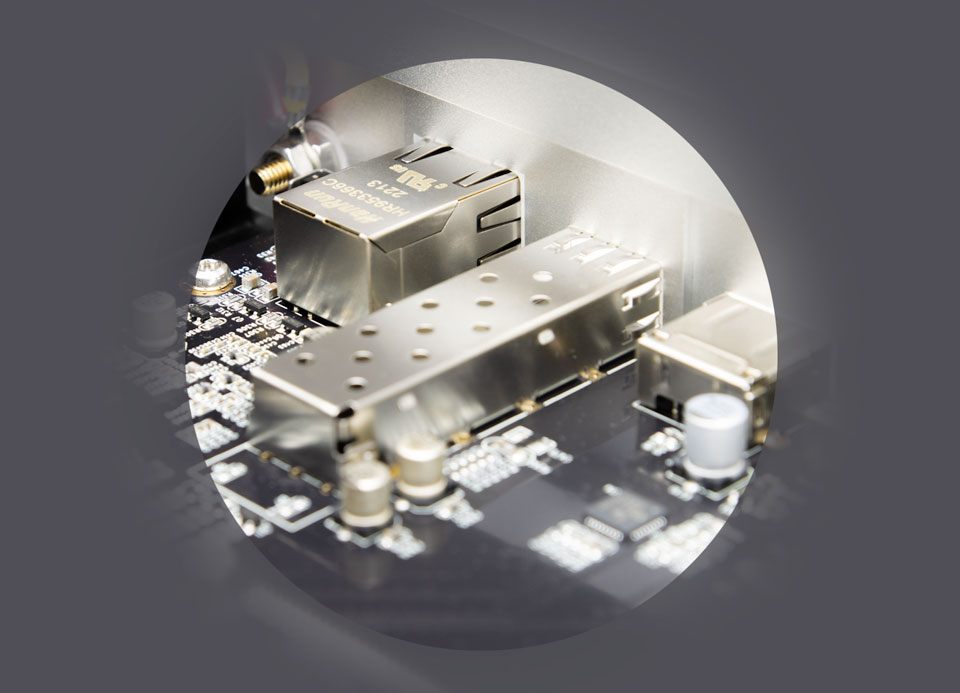 - SFP-Anschluss für optisches Netzwerk mit integriertem Netzwerkswitch
